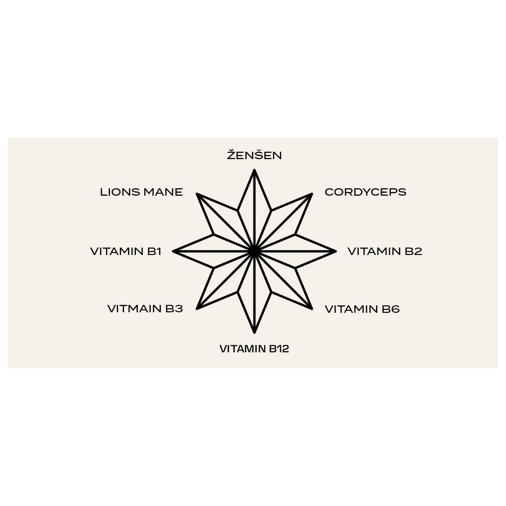 Kapsle vychází z tradic čínské medicíny, doplněné moderním vědeckým přístupem západu. Jsou sofistikovanou alternativou ke stimulantům — inteligentní, přírodní a harmonické. Precizní formulace spojuje Cordyceps, Lion’s Mane, Ženšen a vitaminy B1, B2, B3, B6 a B12, které přirozeně podporují energii, kognitivní funkce a imunitní rovnováhu.